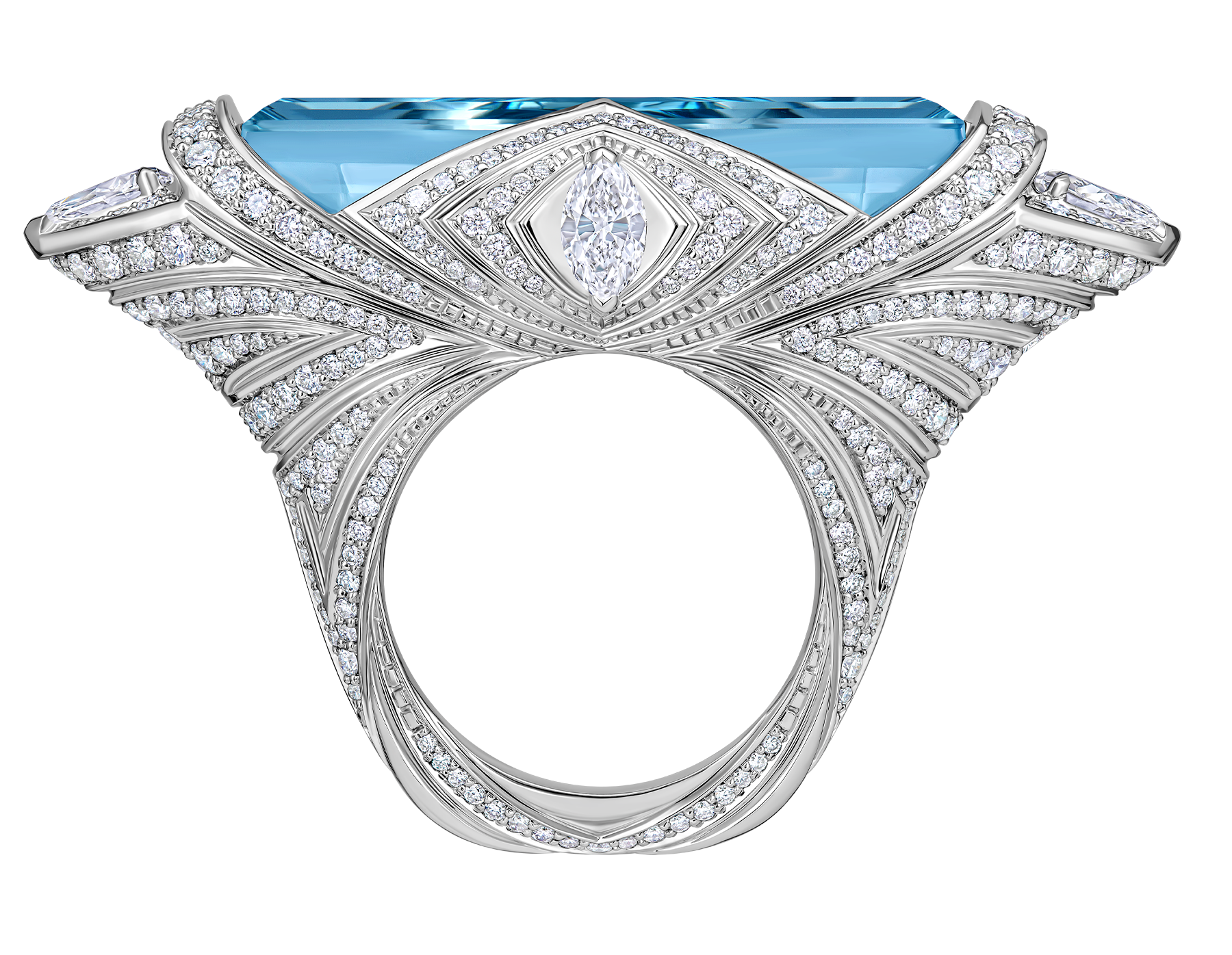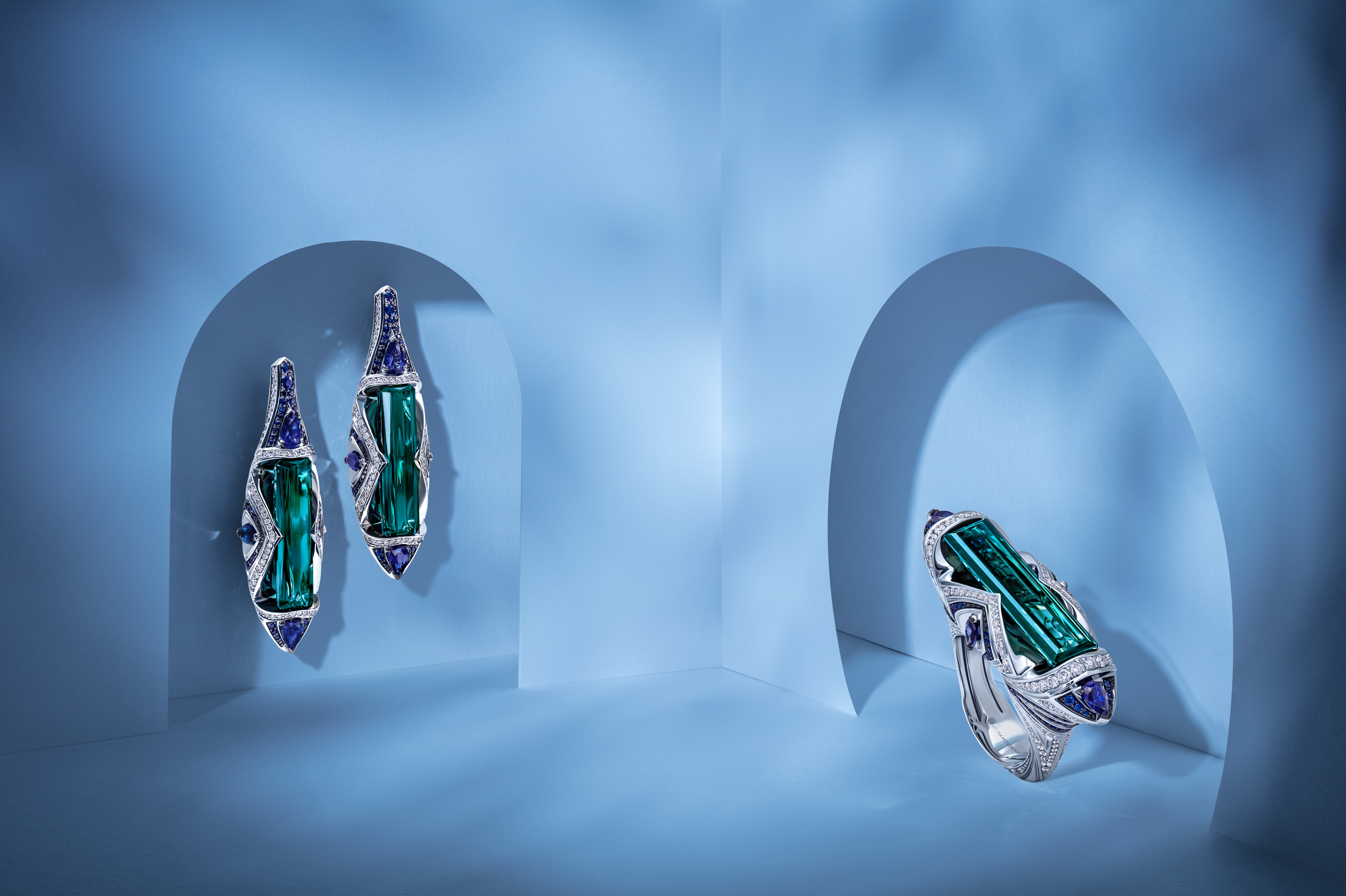 Главную роль в украшениях ювелиры отвели превосходным самоцветам – турмалинам индиголитам чарующего сине-зеленого оттенка. Яркий колорит солирующих камней огранки «багет» дополнили насыщенные сапфиры и более семисот безупречных бриллиантов классической и фантазийных форм. Со временем коллекцию пополнили и другие вариации сета – с утонченными голубыми аквамаринами и выразительными турмалинами верделитами.