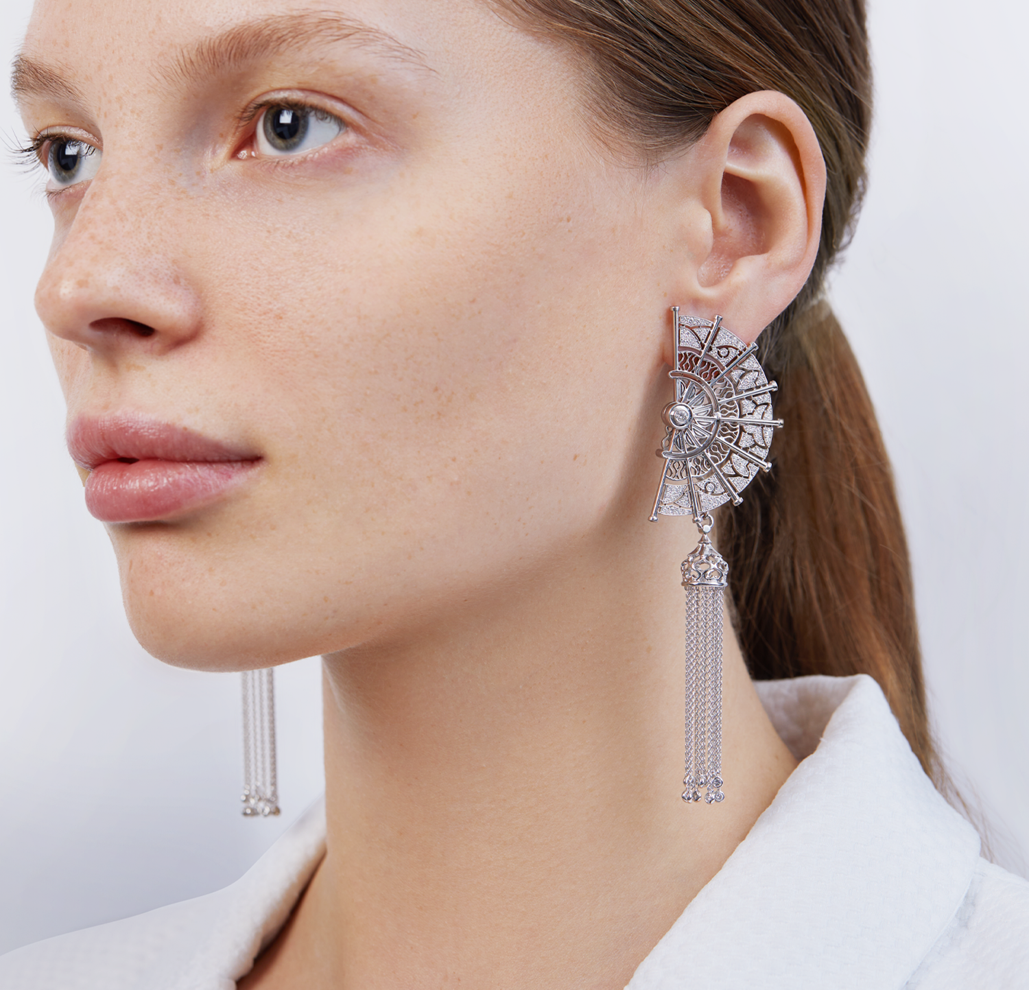 Творческое переосмысление фирменного мотива веера – грандиозный эксперимент, благодаря которому драгоценности, выполненные с непревзойденным мастерством, обретают новое звучание и энергию. Ажурные узоры, изящные линии, кокетливо ниспадающие цепи и выразительная экспрессия украшений наилучшим образом передают индивидуальность и неповторимость женщины.
