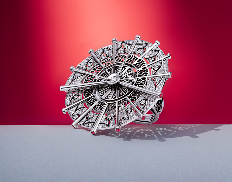 В изысканном кольце с яркой стилистикой ар-деко воссоздан знаковый светский атрибут. Сочетание сияющих бриллиантов и насыщенных рубинов создает ослепительную композицию. Не забывая, что веер не только декоративный, но и функциональный предмет, ювелиры наделили украшение свойством трансформации. Драгоценные створки веера подвижны, обладательнице остается лишь выбрать понравившееся положение.