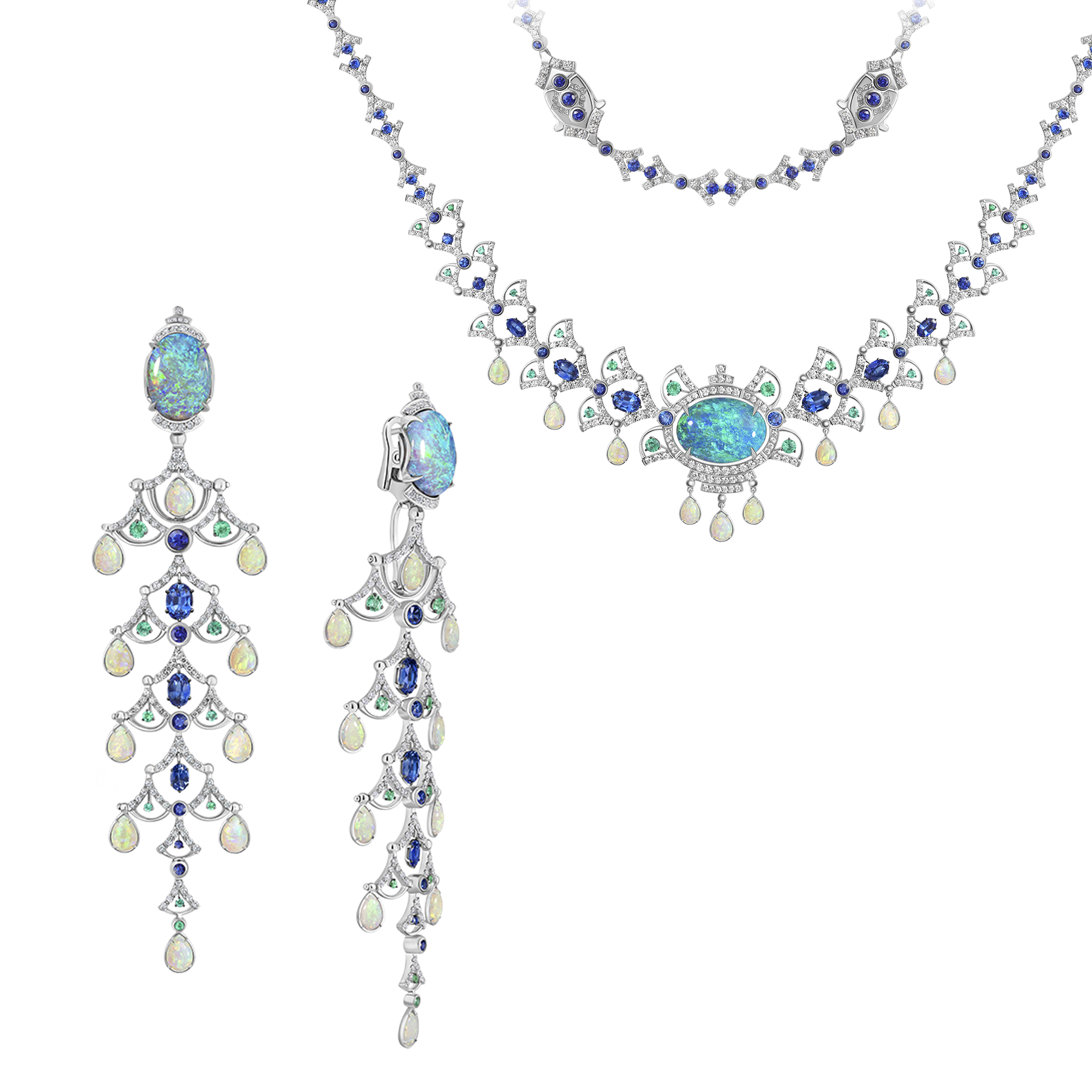 Магические опалы в украшениях передают необыкновенное ночное свечение футуристичного города, а инкрустация рубинами, сапфирами и изумрудами подчеркивает природную красоту опала и создает цельный образ ночного мегаполиса.