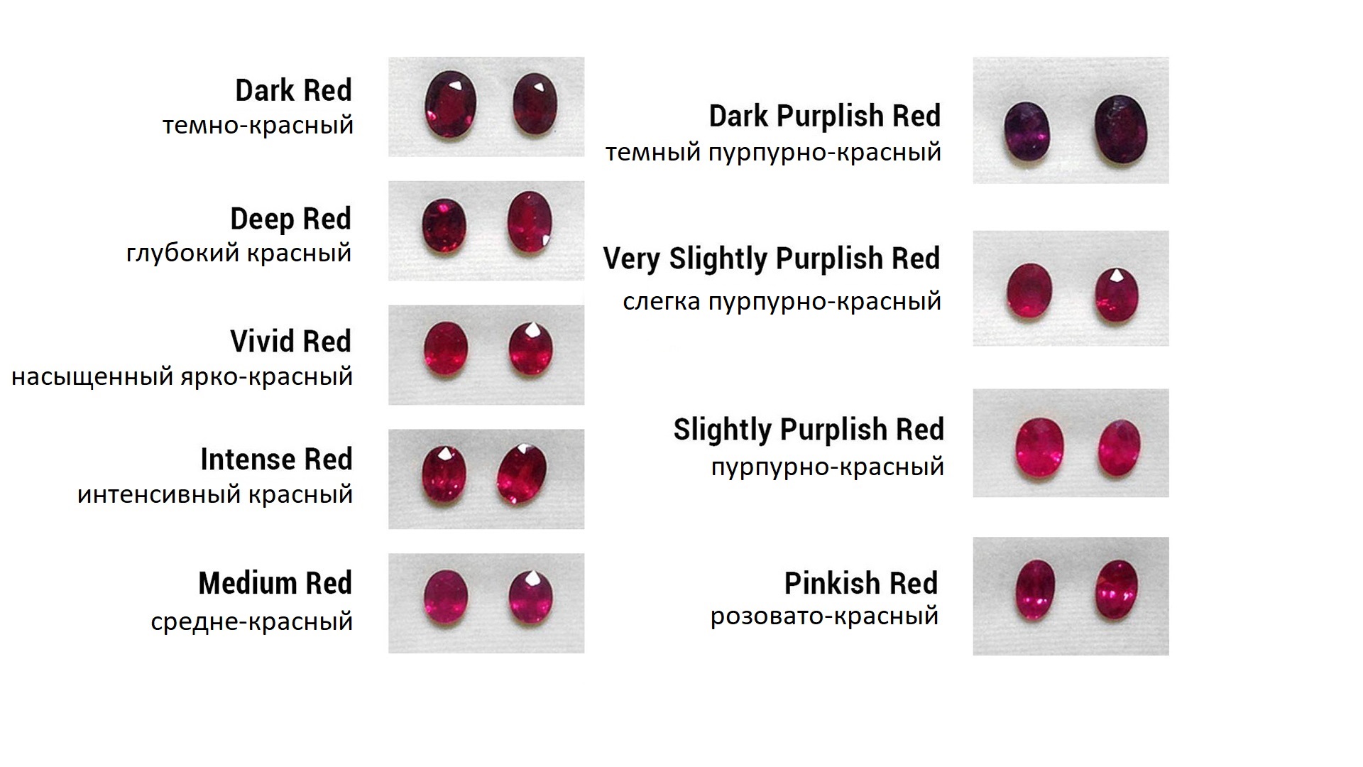 Особое место в цветовой гамме рубинов занимает термин pigeon’s blood. Такое название оттенка возникло в отношении уникальных корундов добытых в Бирме, регион Могок. Эксперты описывают pigeon’s blood как насыщенный красный с легким синеватым отливом.