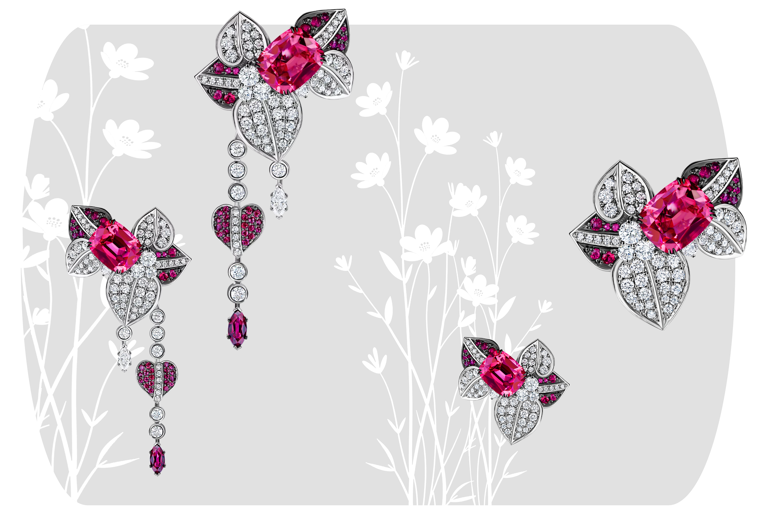Серьги «Королева сердец» – яркое дополнение коллекции Flora, символизирующее свободу и возрождение. Дизайн украшения эклектичен в своей асимметрии, но при этом отражает особую эстетику, которую могут привнести только драгоценные камни. Ювелиры, соединив в серьгах розовые шпинели, алые рубины и бесцветные бриллианты, наделили аксессуар природной выразительностью и индивидуальностью. В украшении предусмотрены трансформационные мотивы. Благодаря съемным бриллиантово-рубиновым подвесам серьги видоизменяются до максимально лаконичного варианта.
