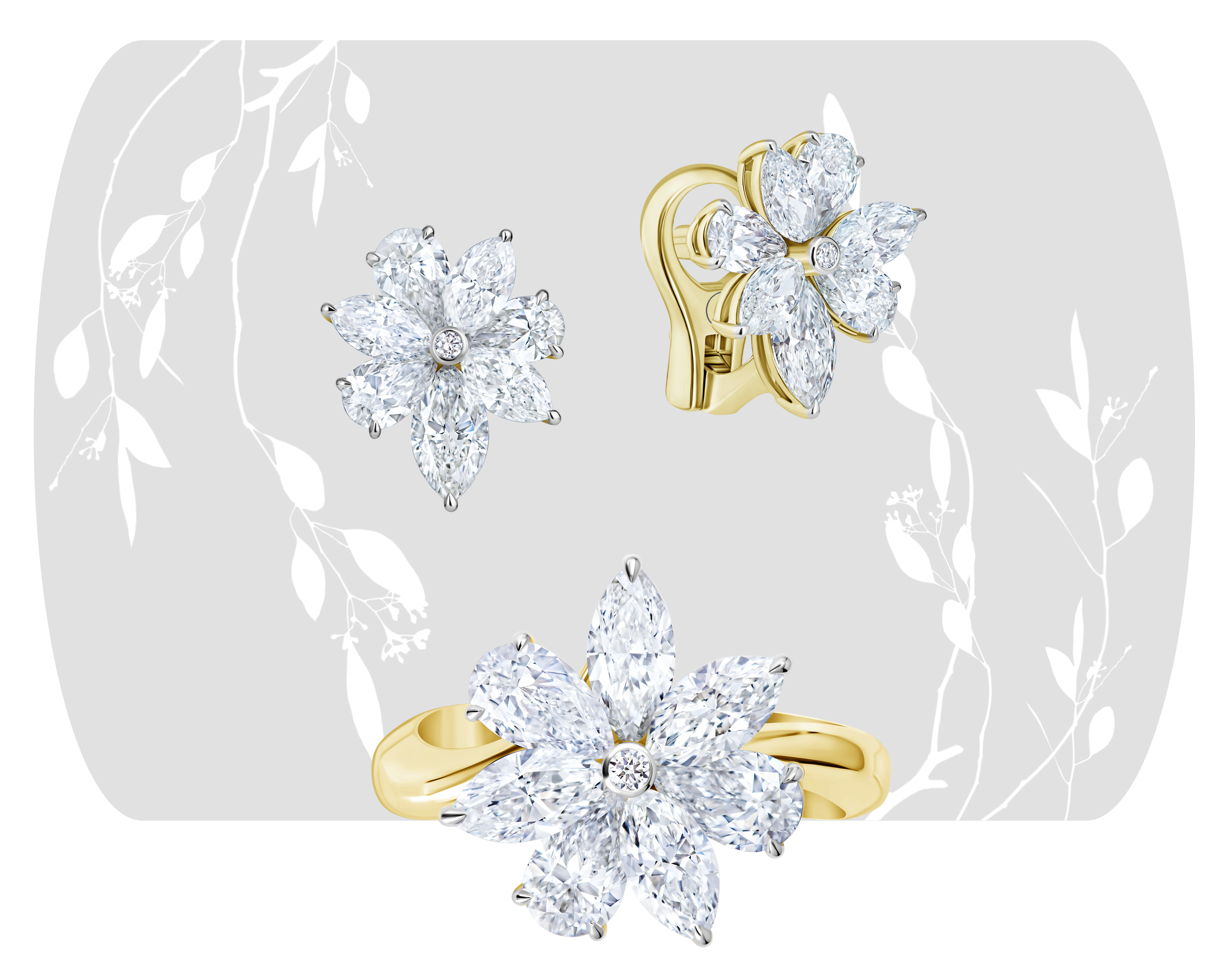 Бриллиантовый сет фантазийной формы из коллекции Flora выполнен в стилистике ар-деко — украшения сета объединяют утонченные классические черты с авангардным решением, которое воспроизводит красоту цветов в идеальном равновесии между оригинальностью и гармонией. В серьгах и кольце 430 бриллиантов выложены в геометрические, словно трехмерные, фигуры, призывая воображение представлять кристаллы льда на нежных лепестках соцветий.