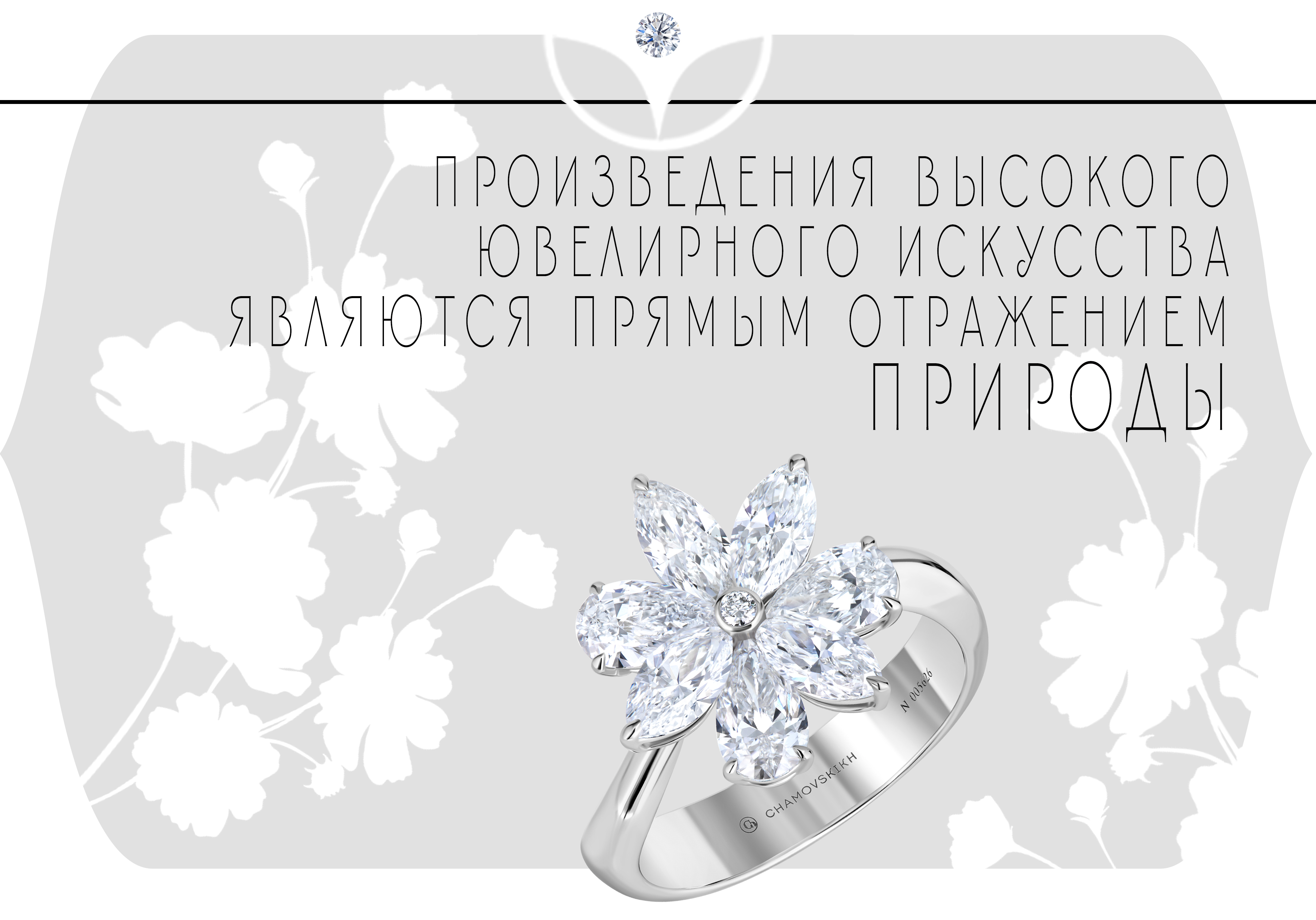 Цветок – истинное воплощение эфемерной красоты природы и ее совершенства, интерпретируемый в ювелирных произведениях самыми разными способами. Украшения Дома CHAMOVSKIKH, вдохновленные флорой, отражают не только реализм с его лаконичностью в простоте линий, но и абстрактное выражение ботанических форм, уверенно заявляя, что тема природы далека от обыденности.