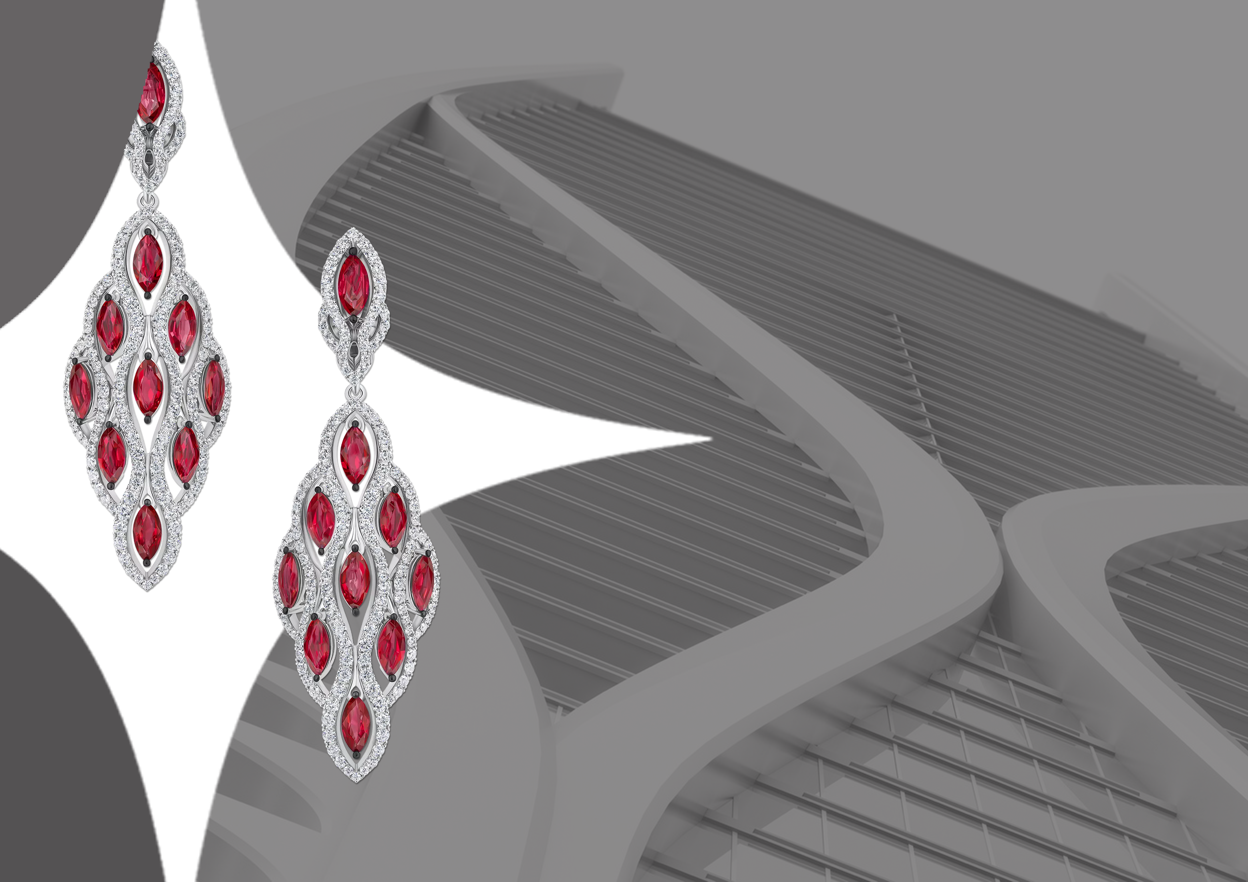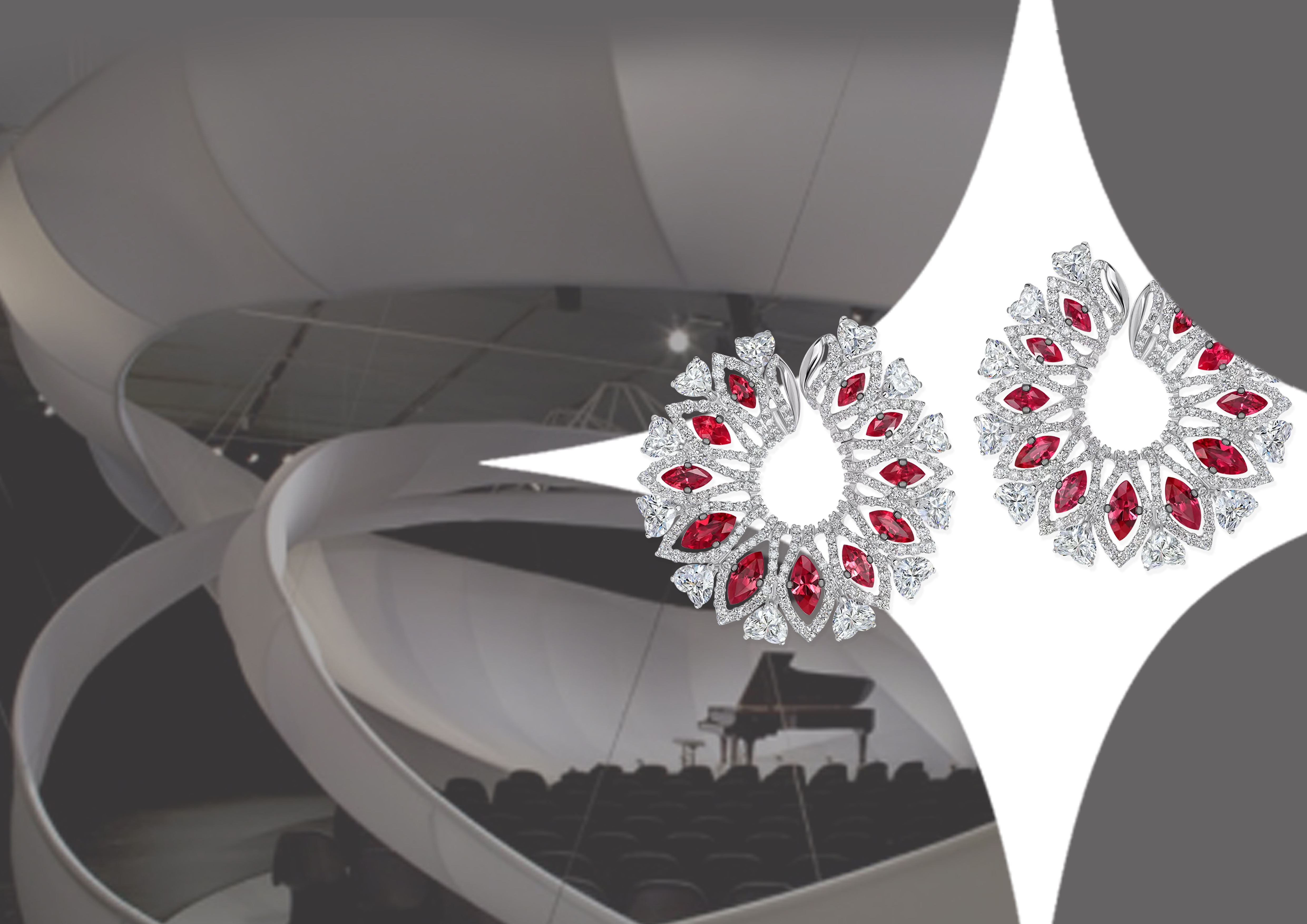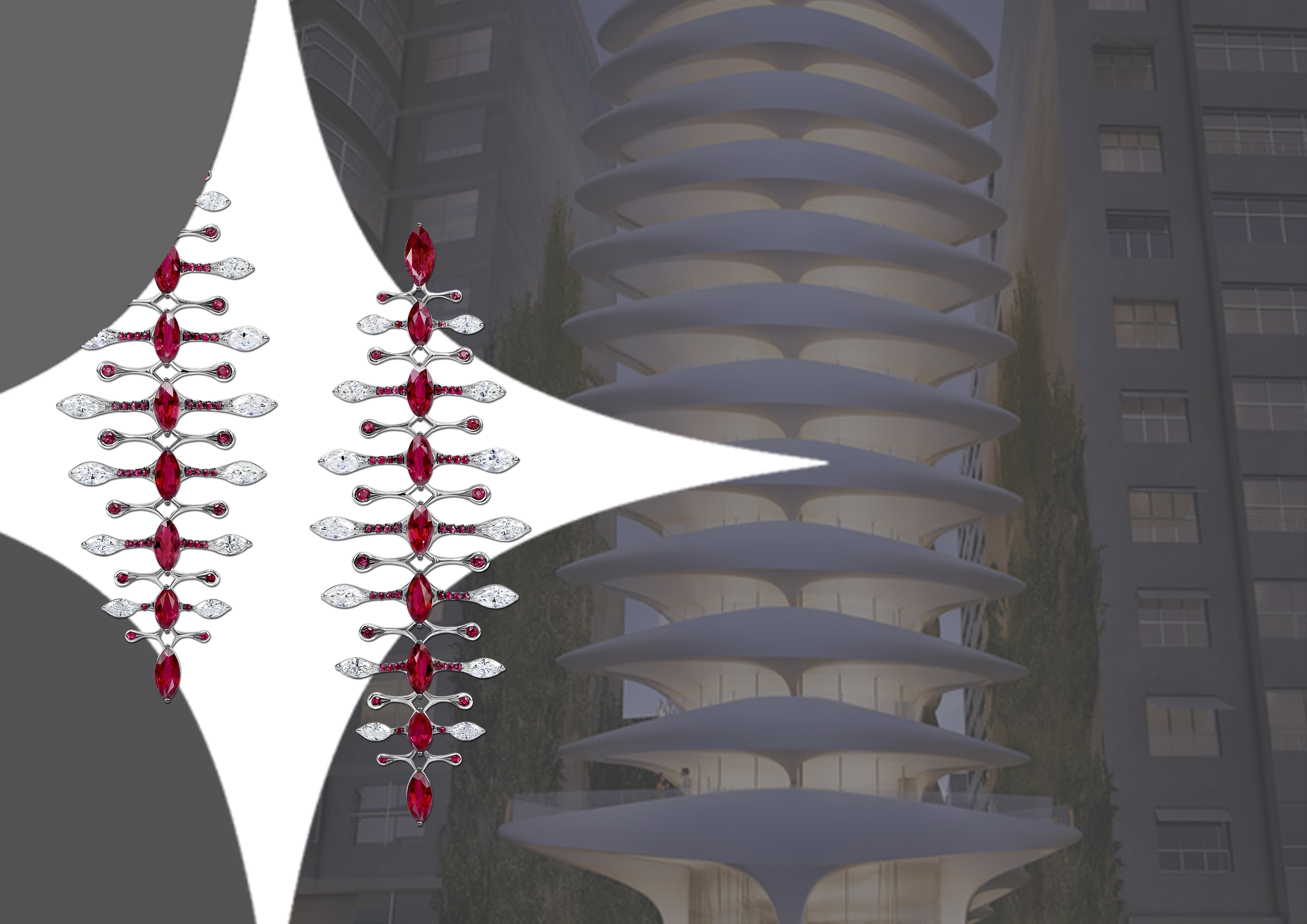 В коллекции также представлены серьги, искусно комбинированные детали и геометрические мотивы которых, передают эклектичный стиль легендарных зданий и переосмысливают эстетичные коды известного архитектора. За цвет в каждом украшении отвечают мозамбикские рубины наивысших характеристик.