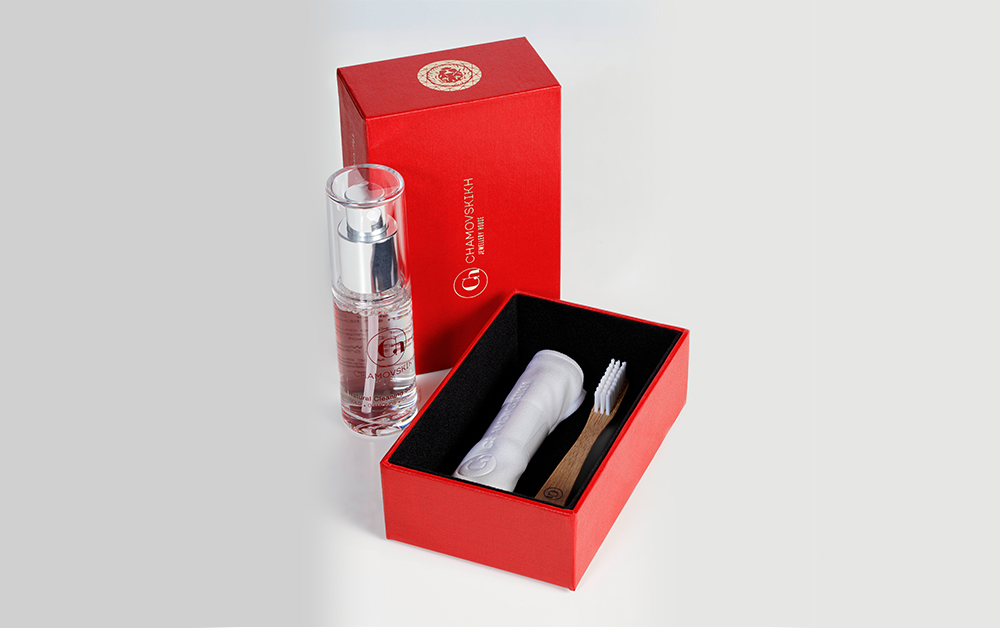 Для сохранения блеска украшений советуем промывать их чистой проточной водой и вытирать сухой мягкой тканью. Рекомендуем чистить ювелирные украшения при помощи фирменного средства для ухода за драгоценностями CHAMOVSKIKH.