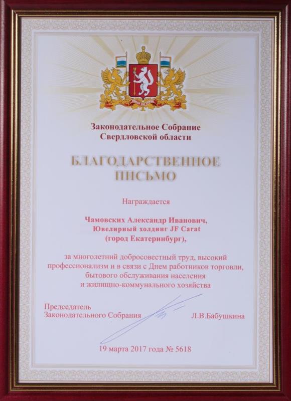 Благодарственное письмо от законодательного собрания г. Екатеринбурга