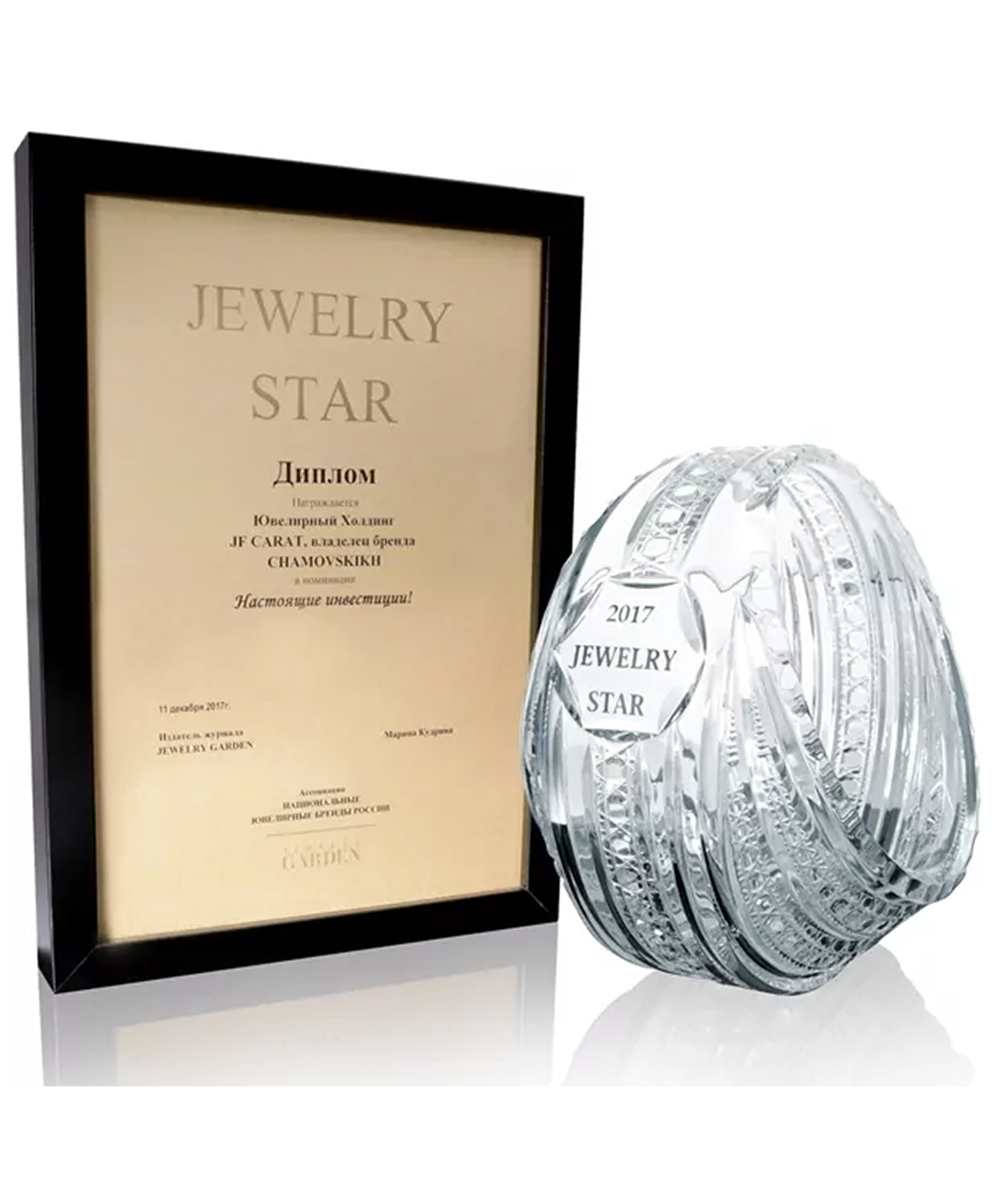 Диплом и награда от журнала Jewelry Garden и ассоциации "Национальные ювелирные бренды России" в номинации "Настоящие инвестиции!"