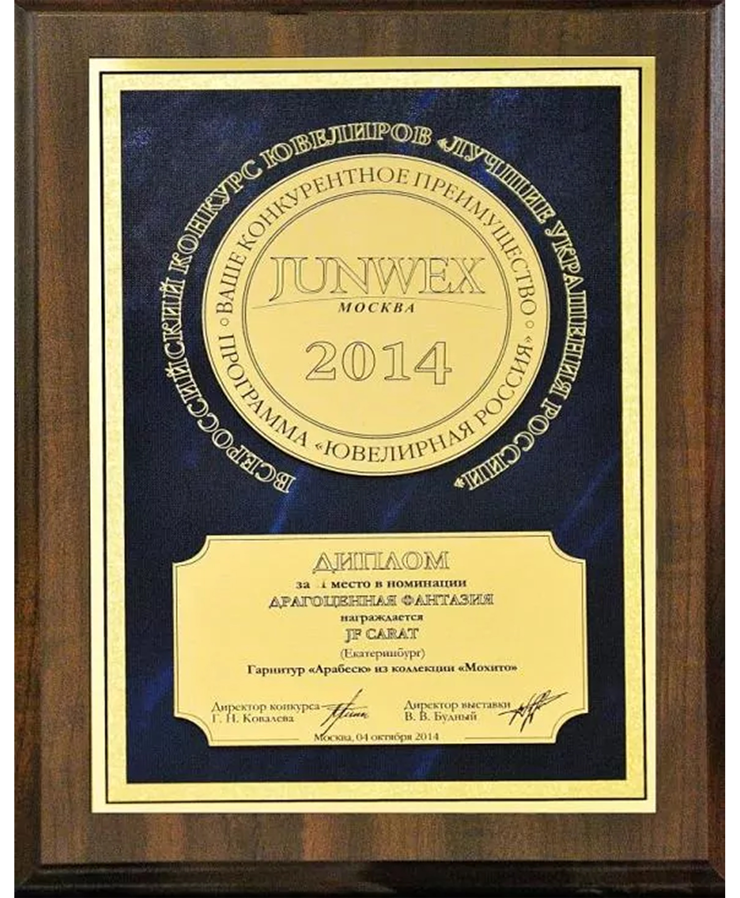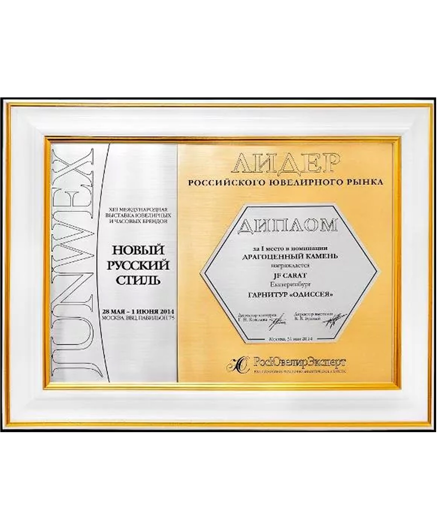 Диплом Junwex Москва. 1 место в номинации "Драгоценный камень" 2014 г. Гарнитур "Одиссея"