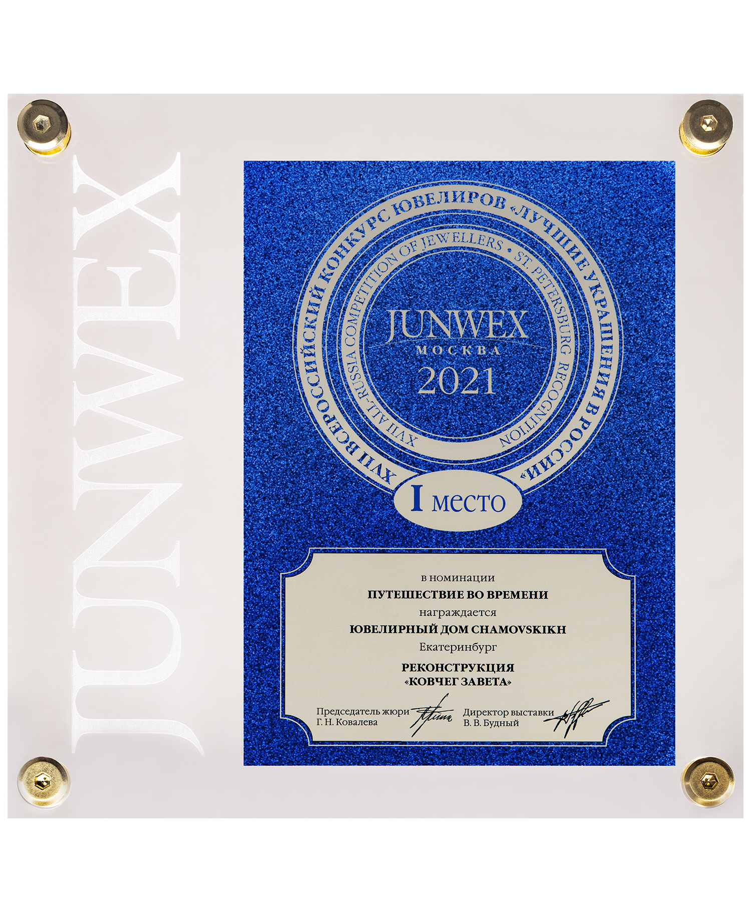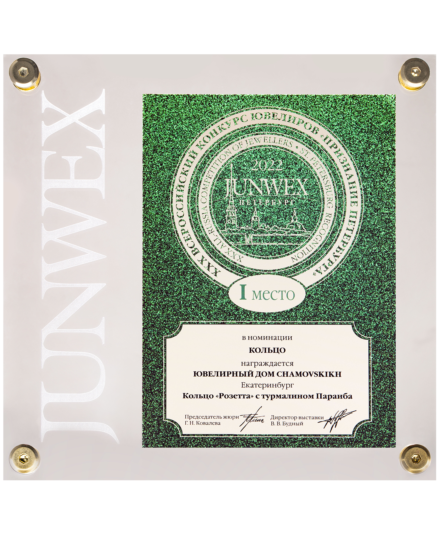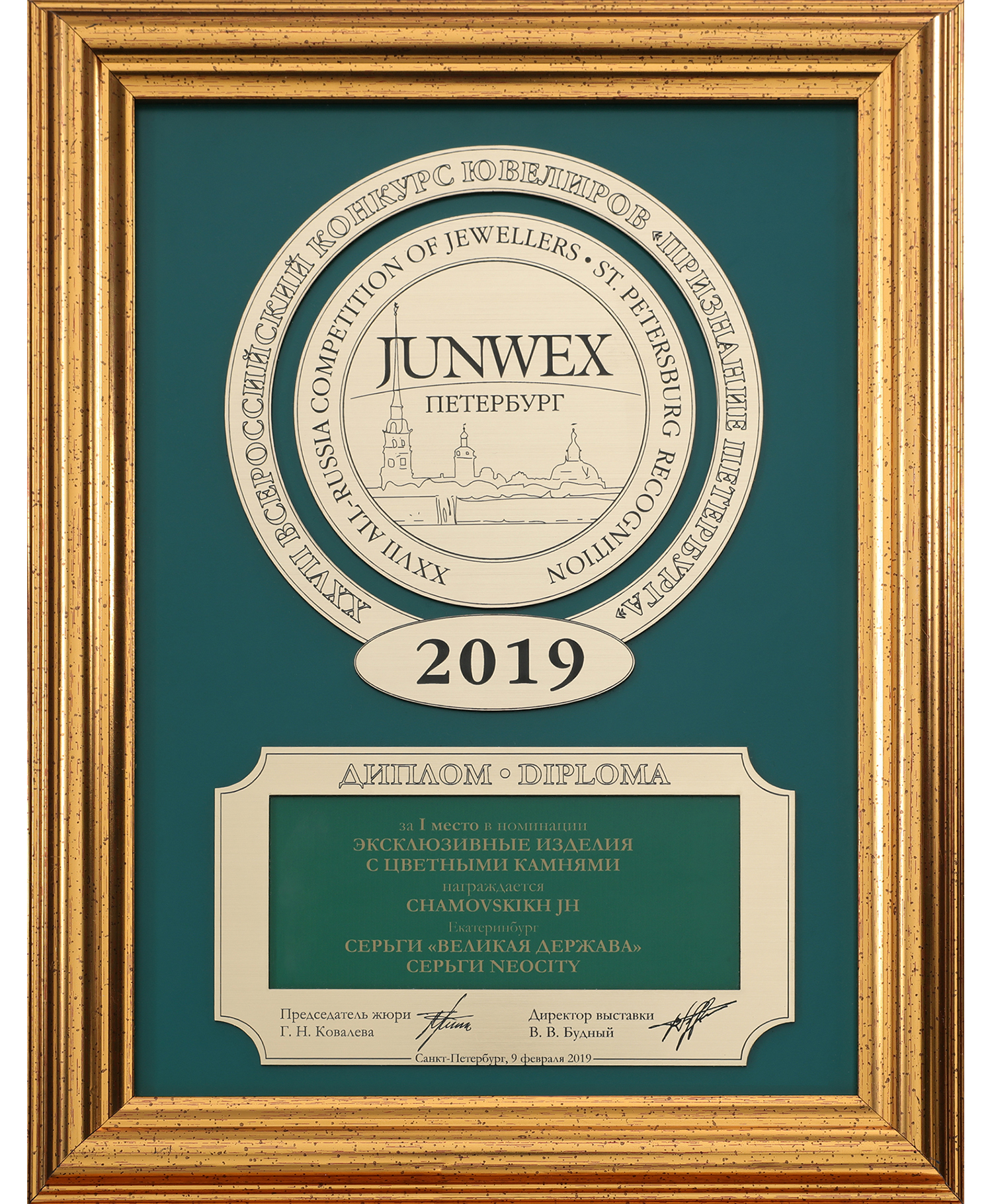 Диплом JUNWEX Петербург за 1 место в номинации "Эксклюзивные изделия с цветными камнями" 2019 г. Серьги "Великая Держава", серьги "NEOCITY"