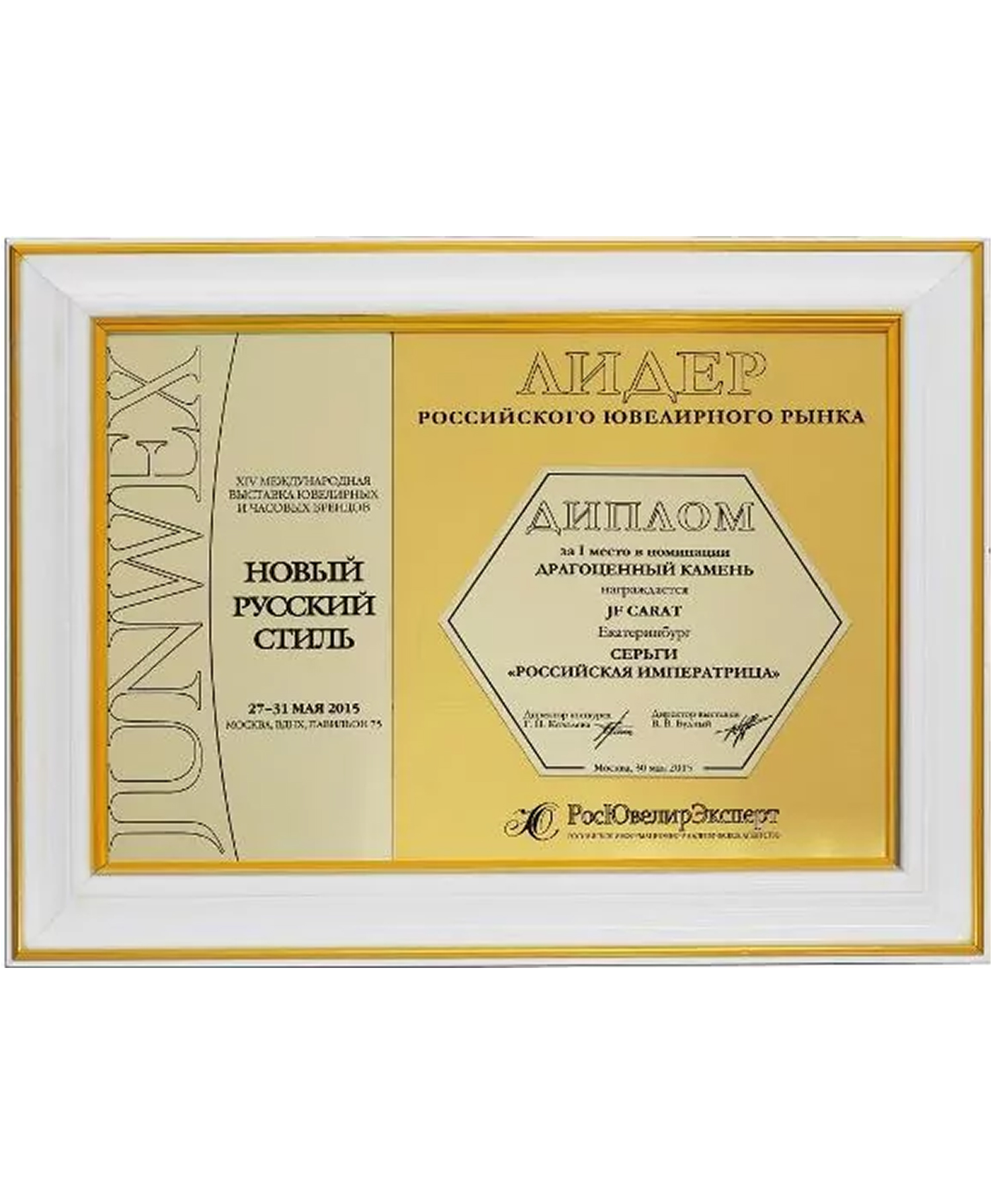 Диплом Junwex Москва. 1 место в номинации "Драгоценный камень" 2015 г. Серьги "Российская Императрица"