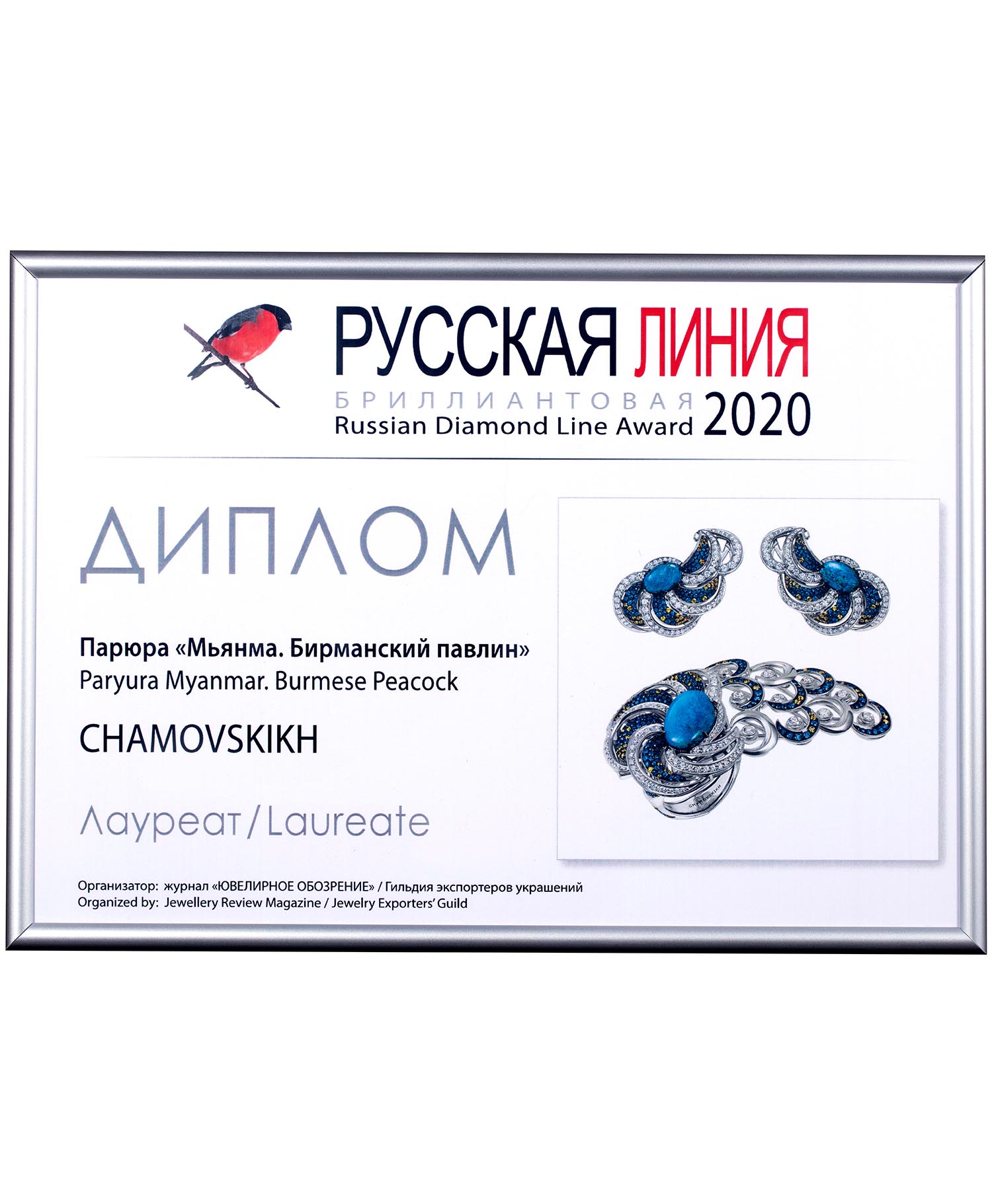 Диплом лауреата конкурса "Русская бриллиантовая линия" 2020г. Парюра "Мьянма. Бирманский павлин"