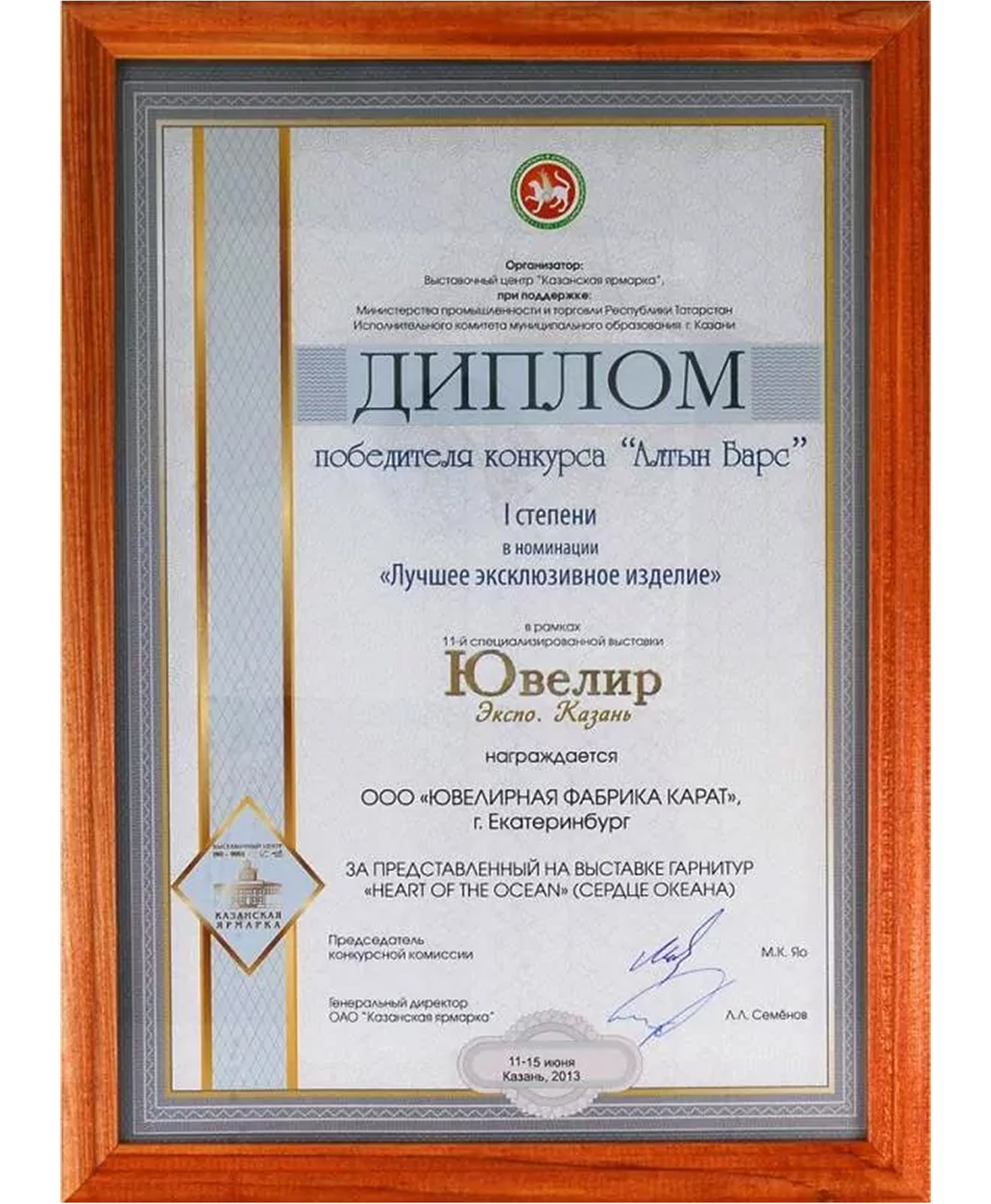 Диплом победителя конкурса "Алтын Барс" 1 место в номинации "Лучшее эксклюзивное изделие" 2013 г. Гарнитур "Сердце океана"