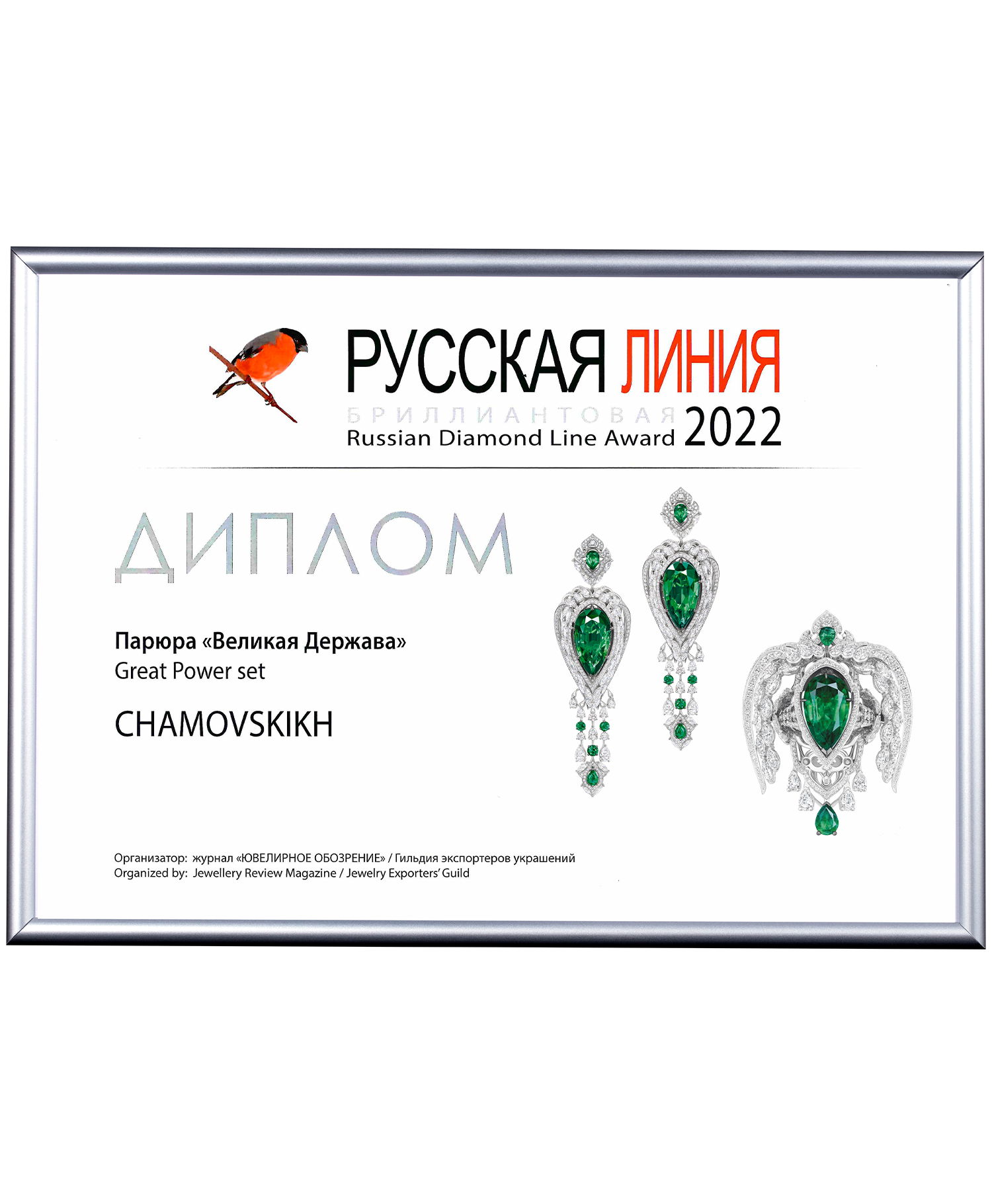 Диплом победителя конкурса "Алтын Барс". Гран-при выставки "ЮвелирЭкспо" 2015 г. Серьги "Российская Императрица"