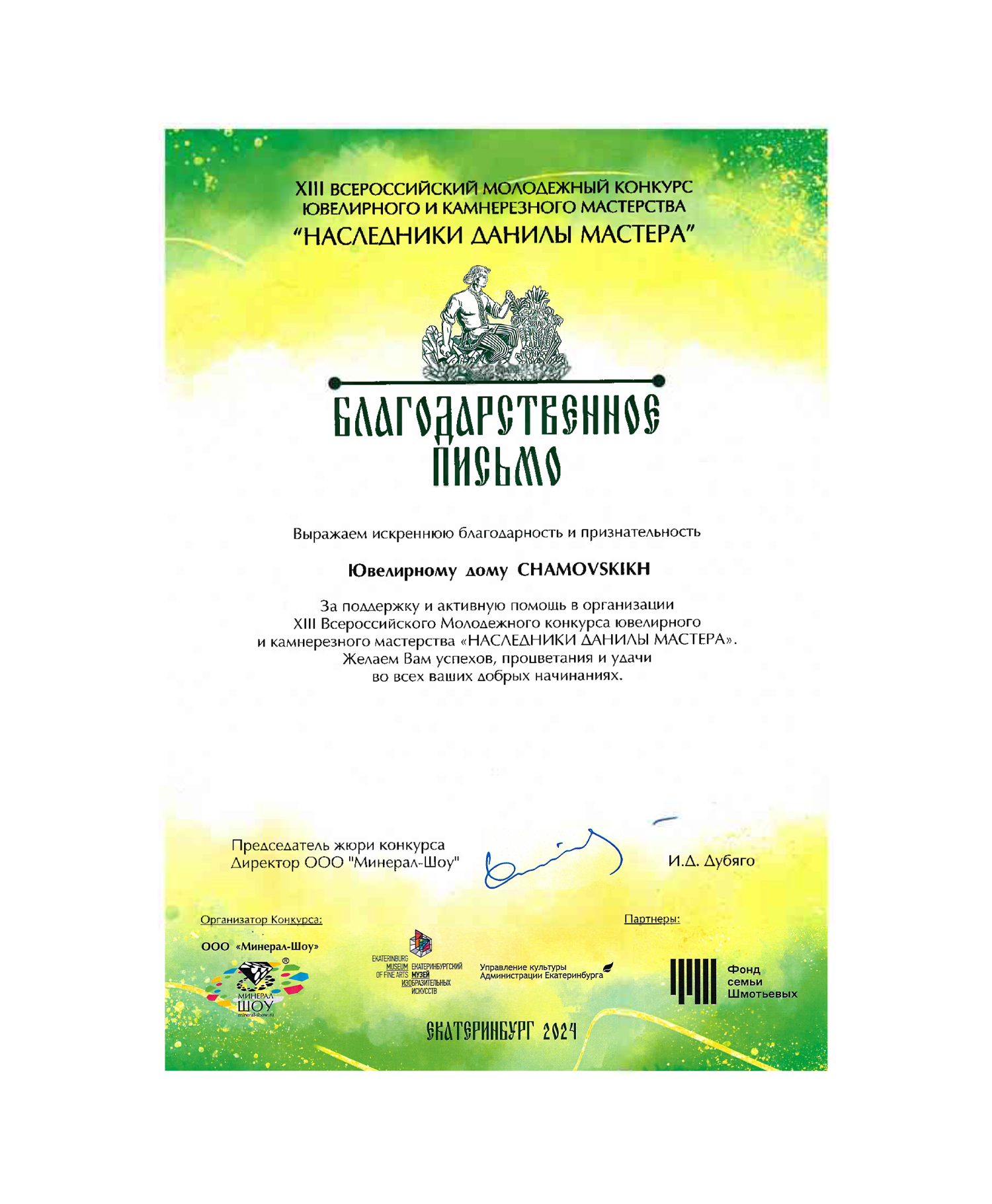 Благодарственное письмо за активную поддержку XIII Молодежного конкурса «Наследники Данилы Мастера»