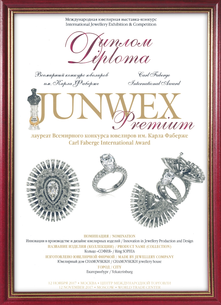 Ювелирный дом CHAMOVSKIKH  стал победителем Всемирного конкурса ювелиров имени Карла Фаберже, который прошел в рамках второй выставки JUNWEX Premium. Эксперты признали бренд лидером в номинации «Инновации в производстве и дизайне ювелирных изделий».