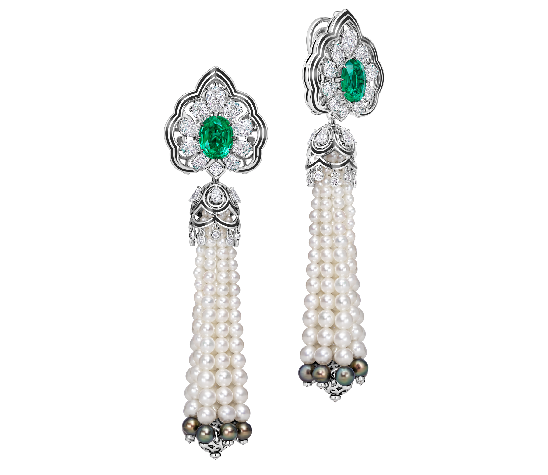 Эталонный оттенок Vivid Green и удивительную чистоту изумрудов подчеркивает игра сотен превосходных бриллиантов. Завораживающее сияние жемчуга напоминает о величественном море, воспетом великим поэтом в «Сказке о царе Салтане».