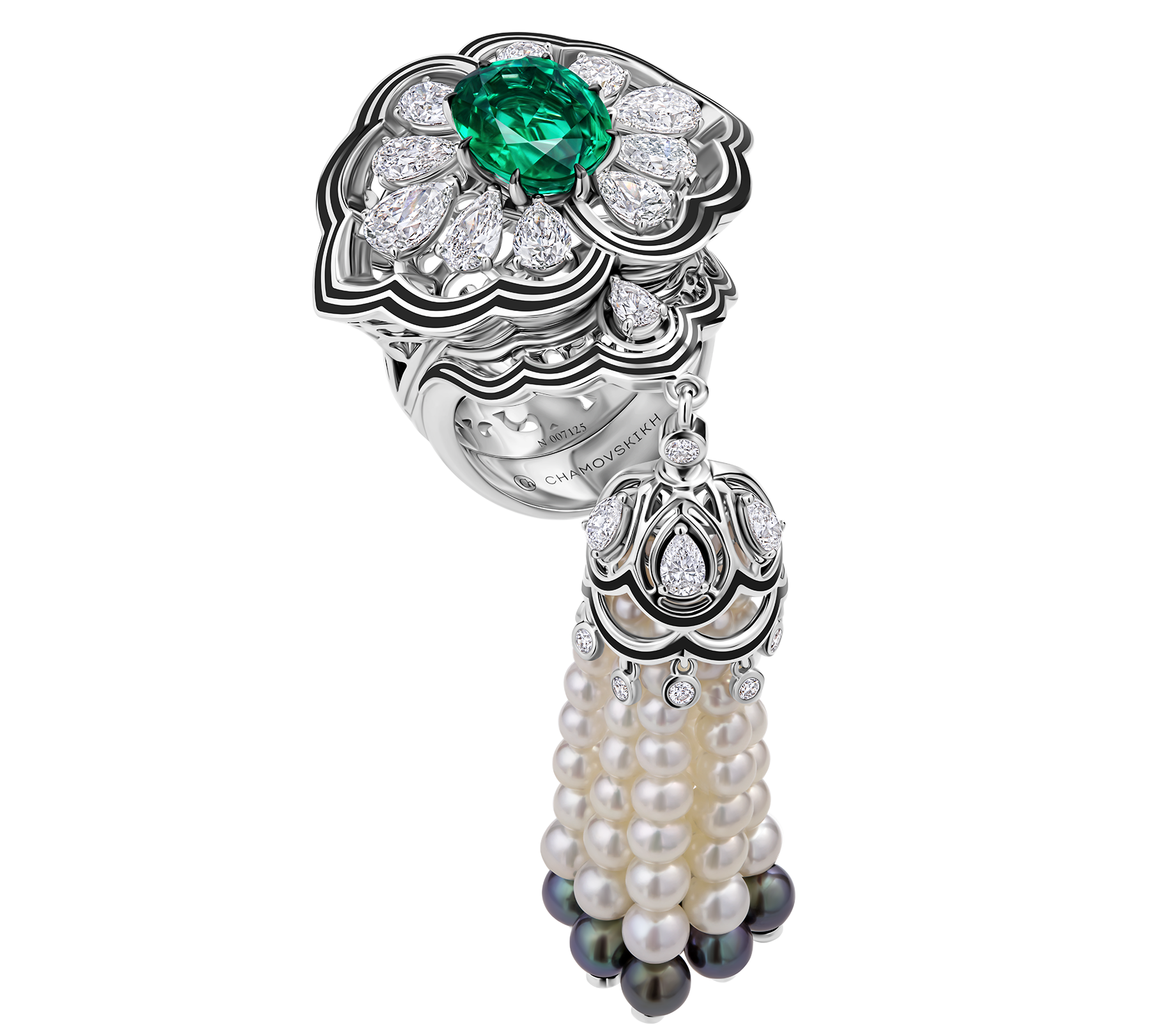Серьги и кольцо с изумрудами, жемчугом и бриллиантами — драгоценное продолжение коллекции CHAMOVSKIKH Royal Jewellery. Ранее ювелиры представили парюры «Царевна-Лебедь» с александритами, турмалинами параибой и рубеллитами. В 2020 году концептуальные украшения стали победителями конкурса международной выставки ювелирных и часовых брендов JUNWEX.