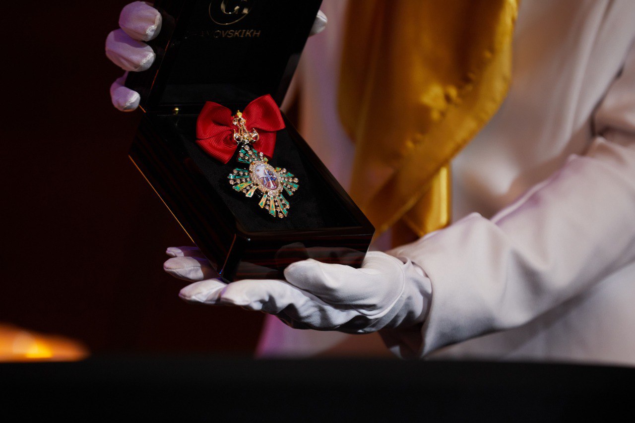 Брошь с бриллиантовой монограммой дополнена знаком-крестом и атласным бантом. Украшение, созданное в единственном экземпляре и переданное в качестве лота благотворительного аукциона главой ювелирного дома Александром Чамовских, принесло в фонд Екатерининской Ассамблеи семь миллионов рублей.