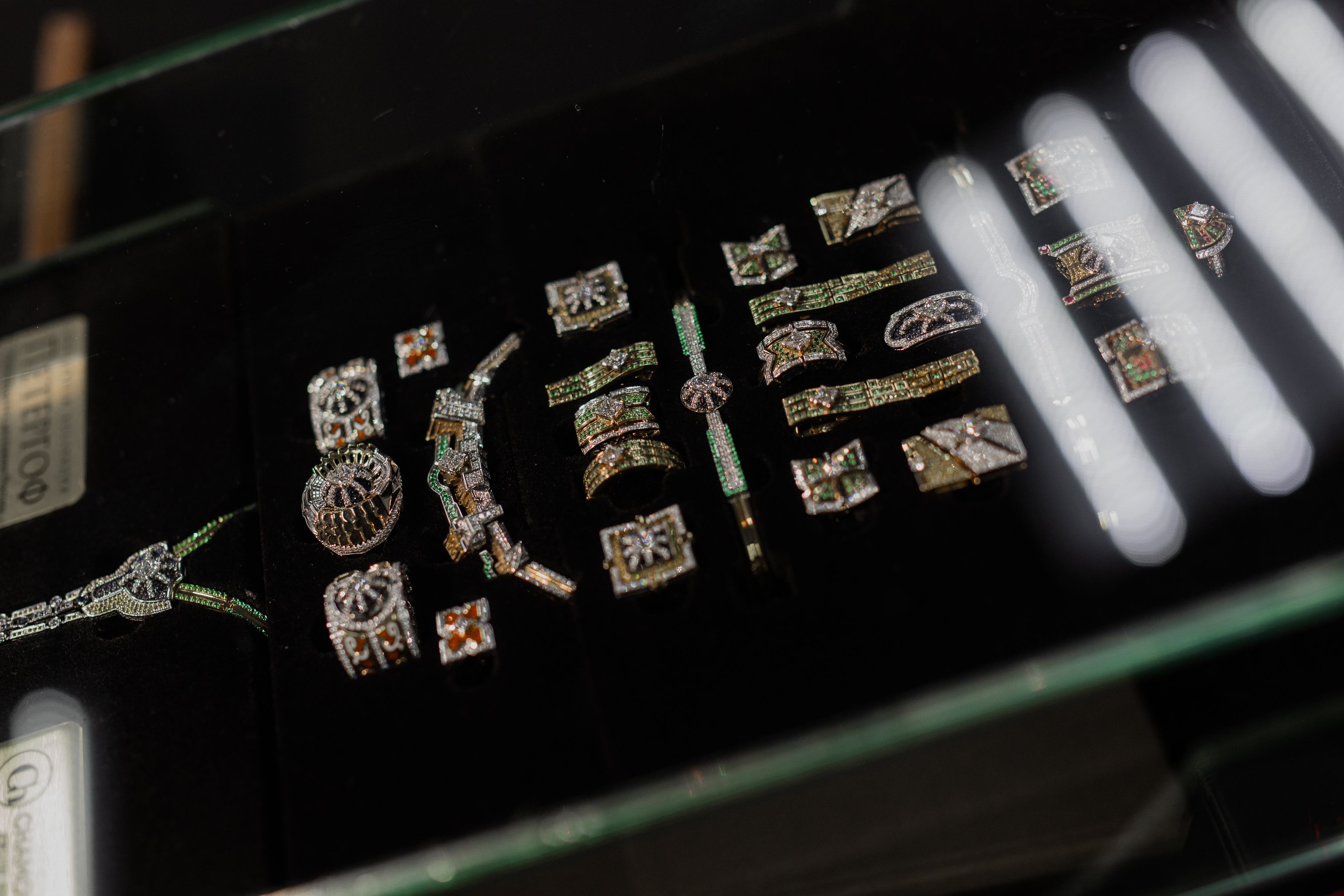 В экспозиции представлены также ювелирная коллекция «Украшения императорских особ», созданная в коллаборации с историком моды Александром Васильевым, миниатюрная копия Царь-пушки и драгоценности — победители и лауреаты престижных профессиональных конкурсов: JUNWEX Петербург, JUNWEX Moscow, «Русская бриллиантовая линия» и всемирного конкурса им. Карла Фаберже.