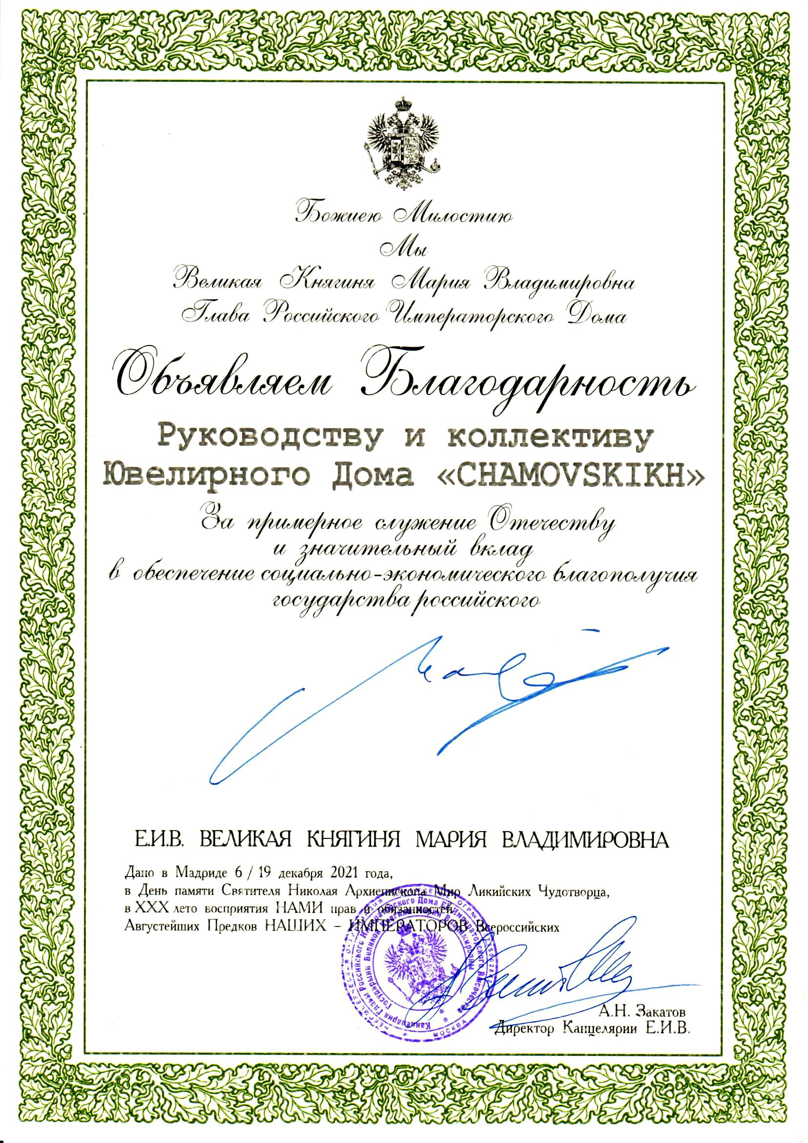 Ювелиры CHAMOVSKIKH получили Высочайшую благодарность Главы Императорского дома Романовых.