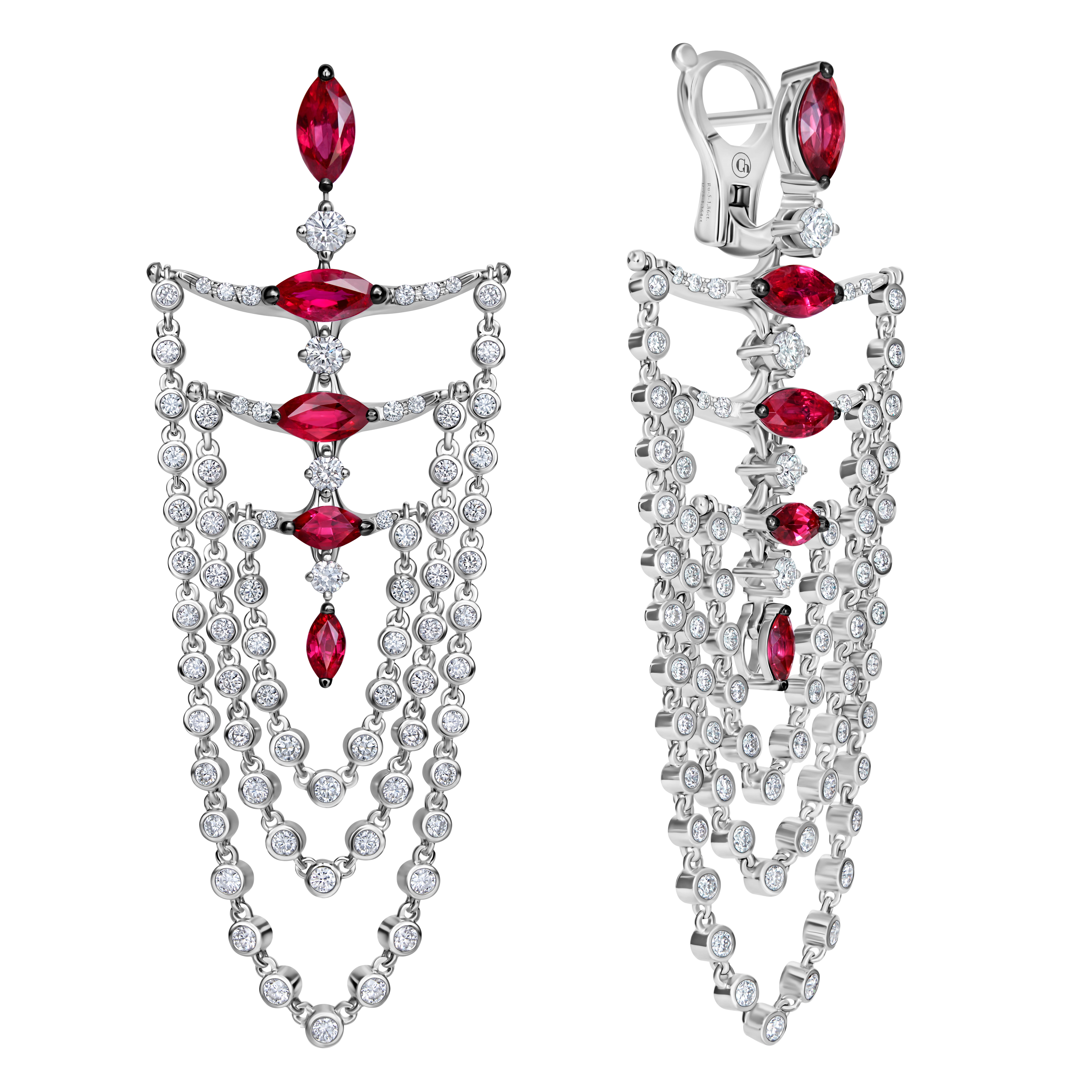 Удлиненные серьги из коллекции NeoCity завораживают плавным движением подвесных элементов, инкрустированных 150-ю бриллиантами топовых характеристик. Яркий акцент statement-украшению придают 10 природных рубинов огранки «маркиз» общим весом 3,7 ct.